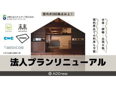 住まいのサブスク・多拠点居住プラットフォーム「ADDress」を運営する株式会社アドレス(本社:東京都千代田区、代表取締役社長:佐別当隆志、以下ADDress)は法人プランをリニューアルし、月額固定費用0円からの完全従量課金で利用可能な新サービスを開始しました。ADDressは国内外に280軒以上あり、同プランは出張や合宿・研修等での利用で経費削減*の他、休暇やワーケーションの福利厚生等、多様な用途で利用ができます。