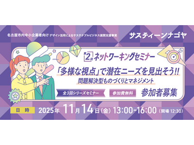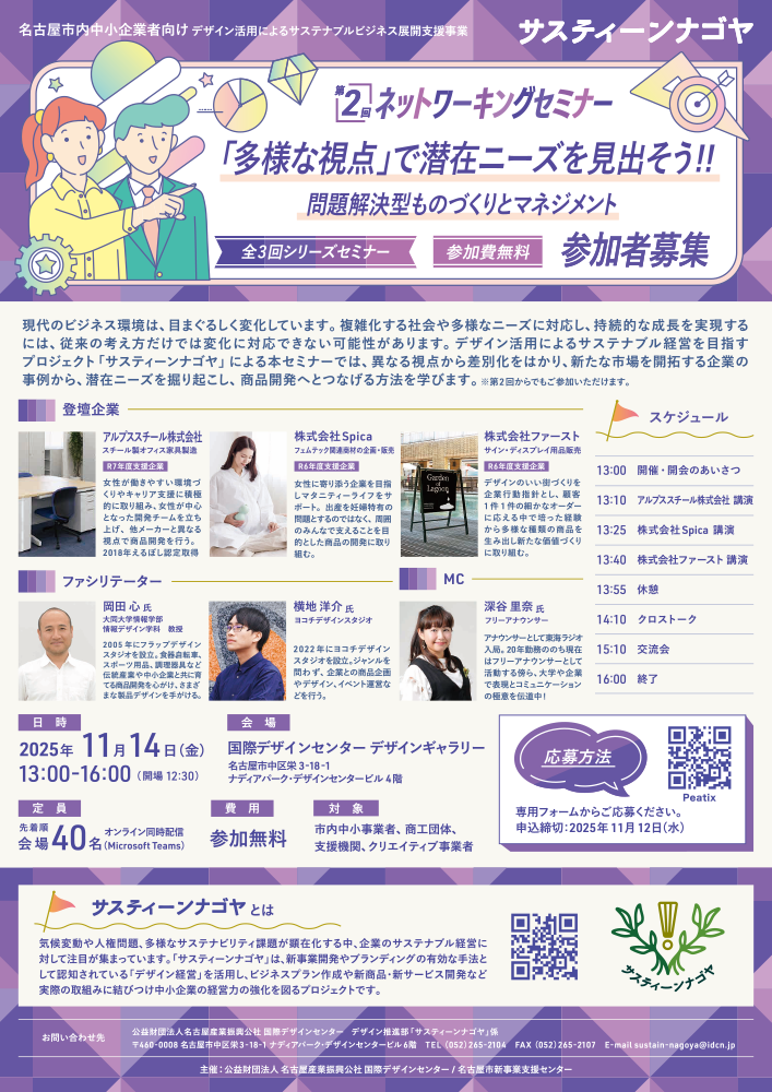 デザイン活用によるサステナブル経営を目指すプロジェクト「サスティーンナゴヤ」による本セミナーでは、異なる視点から差別化をはかり、新たな市場を開拓する企業の事例から、潜在ニーズを掘り起こし、商品開発へとつなげる方法を学びます。