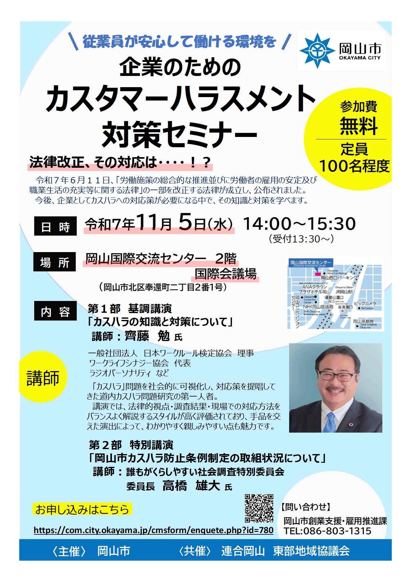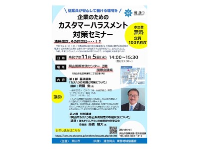 令和7年6月11日、「労働施策の総合的な推進並びに労働者の雇用の安定及び職業生活の充実等に関する法律」の一部を改正する法律が成立し、公布されました。今後、企業としてカスハラへの対応策が必要になる中で、その知識と対策を学べるセミナーの参加者を募集します。