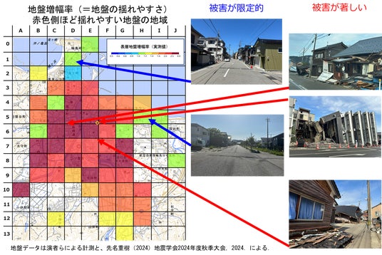 輪島市街にて家屋は揺れやすい地盤(赤色)で被害が大きい※横山ほか,2025(地盤工学会より)