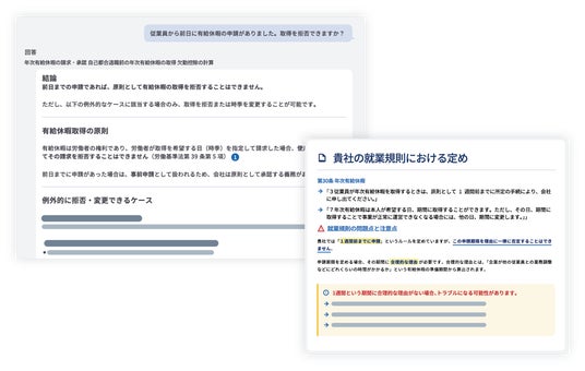 今回のアップデートにより、就業規則や賃金規程などをAIに読み込ませることで、会社ごとのルールをふまえた回答の生成が可能となりました。