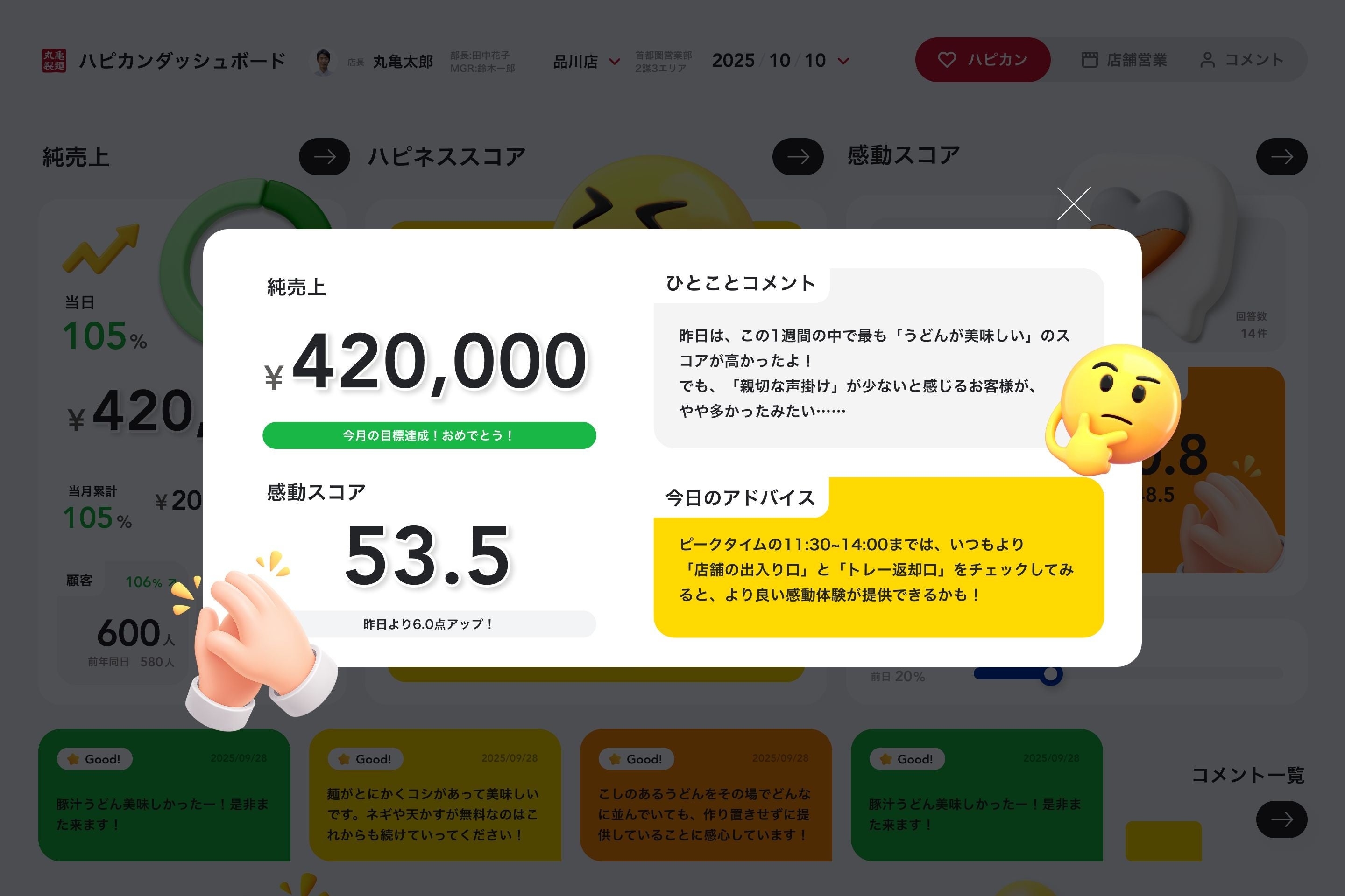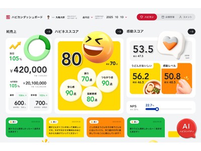 「心的資本経営」を原動力に、世界中へ食の感動体験を提供する株式会社トリドールホールディングス(東京都渋谷区、代表取締役社長 兼 CEO 粟田 貴也、以下、トリドールHD)は、従業員の幸福感(ハピネス)とお客様の感動(カンドウ)が好循環する独自の実践モデル「ハピカン繁盛サイクル※1」をデータドリブンに強化するシステムとして、従業員の「ハピネススコア※2」と顧客の「感動スコア※3」や各店舗での成功事例データなどをもとにAIエージェントが分析し最適な改善アクションを自動提案する「AIレコメンド機能」をアルサーガパートナーズ株式会社(本社:東京都渋谷区、代表取締役会長 兼 CTO:小俣泰明、代表取締役CEO:渡邉純平、以下、アルサーガパートナーズ)と共同開発しました。また、株式会社プレイド(東京都中央区:代表取締役CEO 倉橋健太、以下、プレイド)とともに、これらのデータを集約・可視化し店舗で活用できるダッシュボード、「ハピカンダッシュボード」を開発しました。2025年12月より、丸亀製麺の全店舗で「ハピカンダッシュボード」の運用を開始します。