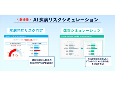 このたび、健康管理システム『HealthCore』に搭載された「AI疾病リスクシミュレーション」は、健診結果に基づき、5年以内の生活習慣病の発症リスクを同性・同年代と比較して表示。疾病発症リスクを下げるために改善が必要な生活習慣(上位5項目)を提示し、目標達成時の健康リスク改善効果をシミュレーションする。従業員は、マイページから自身の生活習慣病リスクを確認でき、生活習慣の見直しや医療機関の受診など、具体的な行動につながることが期待できる。人事・労務担当者、産業保健スタッフは、管理者画面から確認のうえ保健指導等に役立てられ、従業員の健康維持・予防において、より効果的な働きかけが可能となる。