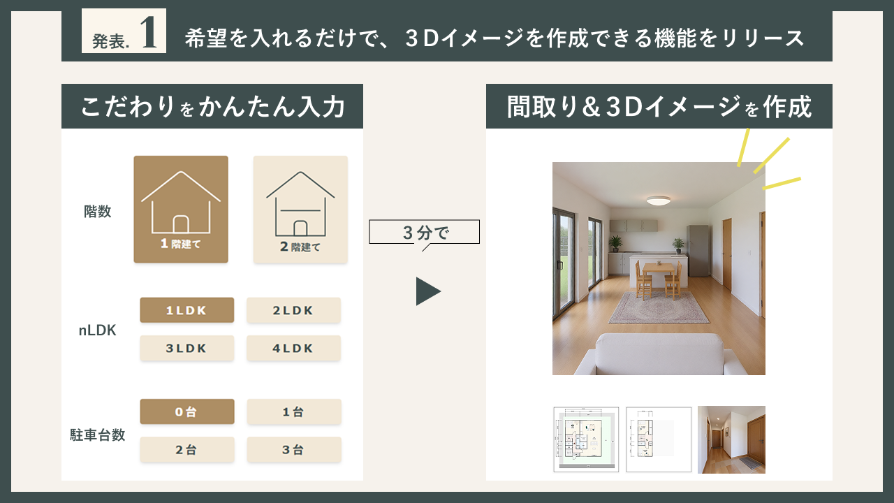 これまで家づくりの初期段階では、図面だけでは空間の広がりや暮らしのイメージをつかみにくいという課題がありました。今回のアップデートにより、ユーザーは希望条件を入力するだけで、