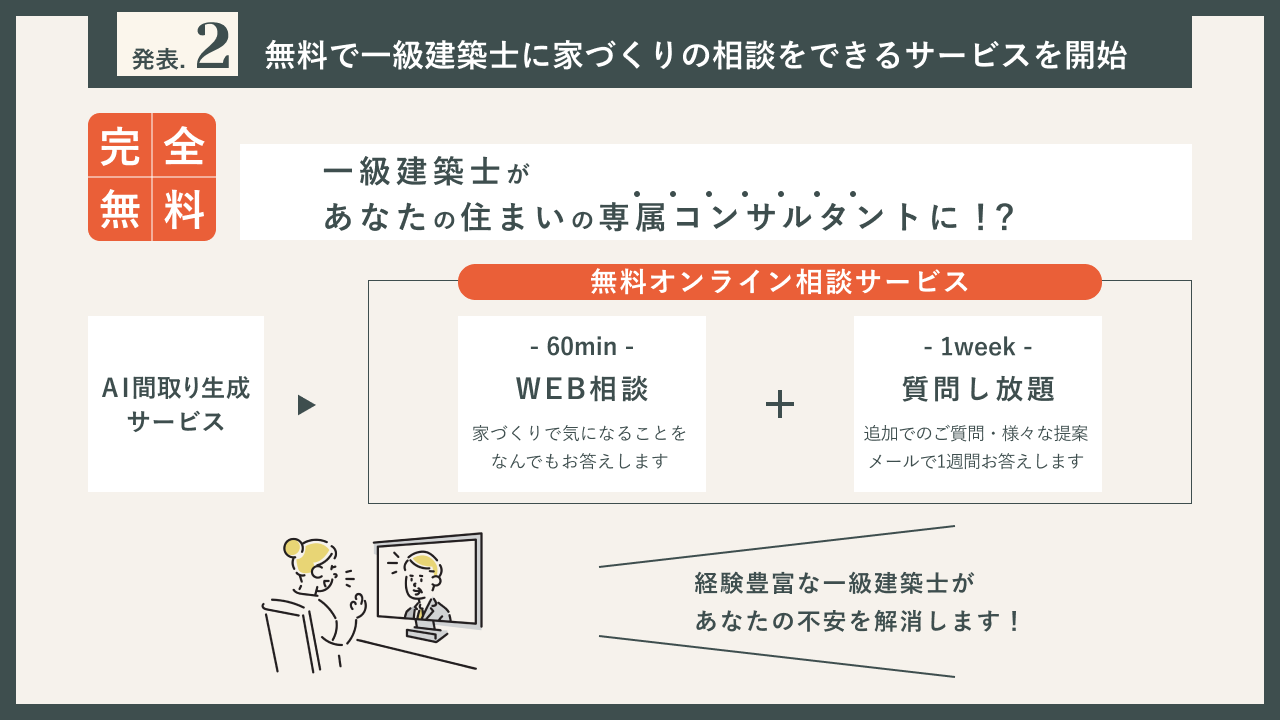 一級建築士に1週間無料で相談できるサービスを同時リリースしました。