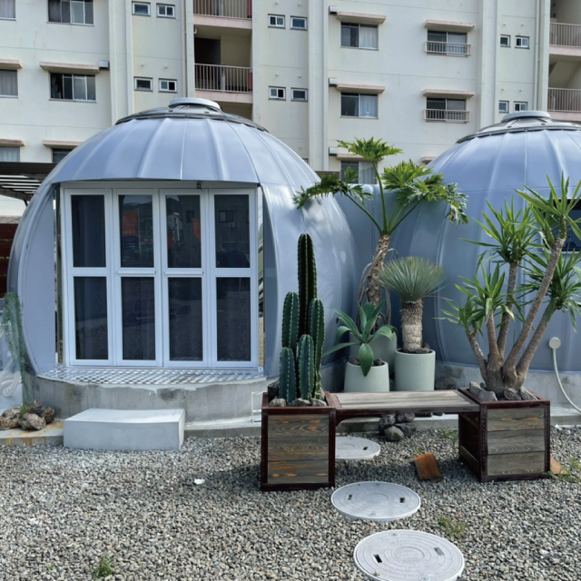 EZDOME HOUSEのドーム型デザインは、自然と調和するためどこに置いても違和感が無く、特に災害時の簡易住居やコンテナハウスのような物々しさを感じさせない点が特徴です。