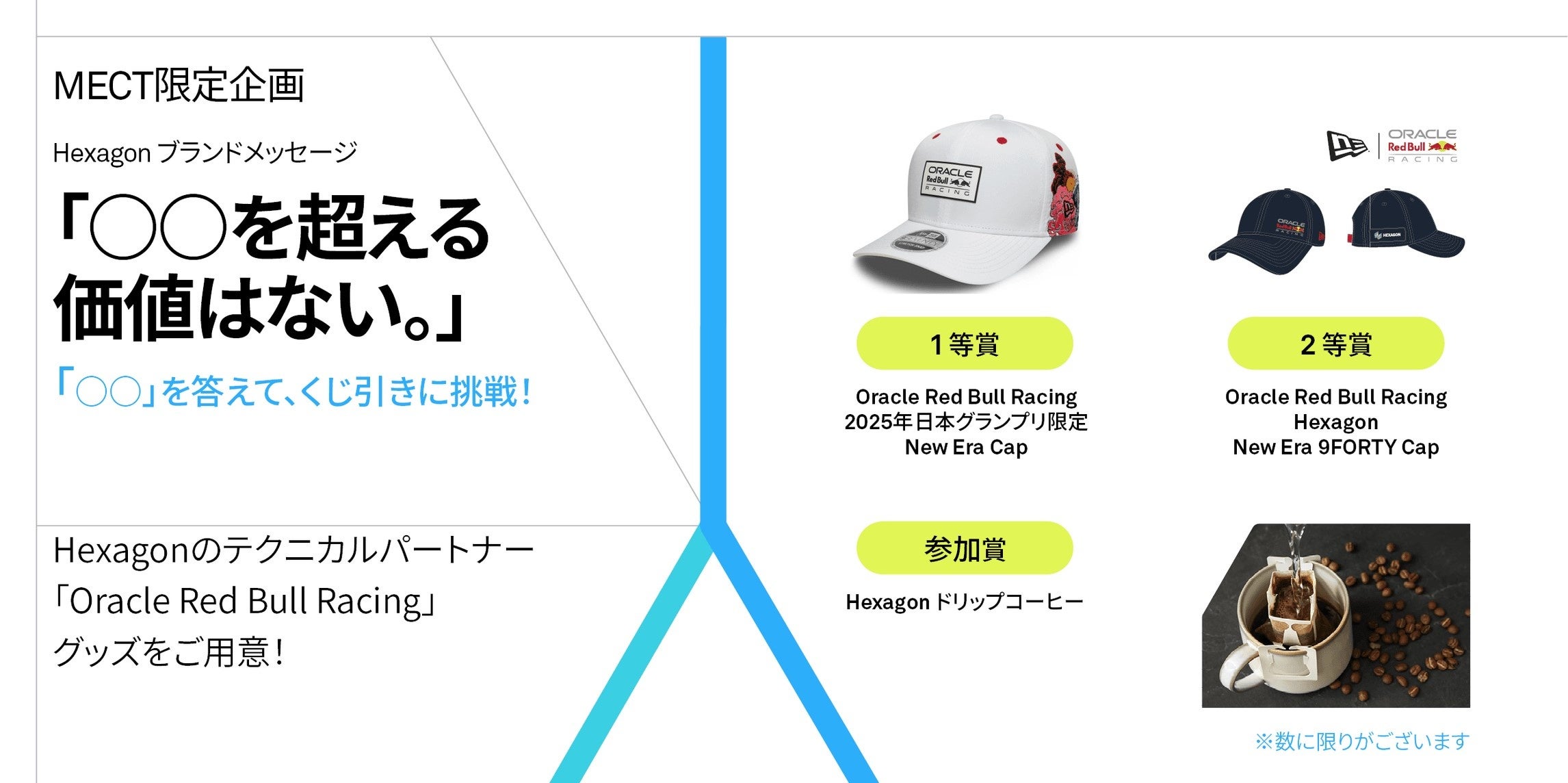 さらに、ブース来訪者限定で、クイズ企画をご用意。クイズに答えると、くじ引きにご参加いただけます。Oracle Red Bull Racing の2025年日本グランプリ限定New Era Capをはじめ、特別な賞品をご用意しておりますので、この機会にぜひHexagonのブースへお越しください。
