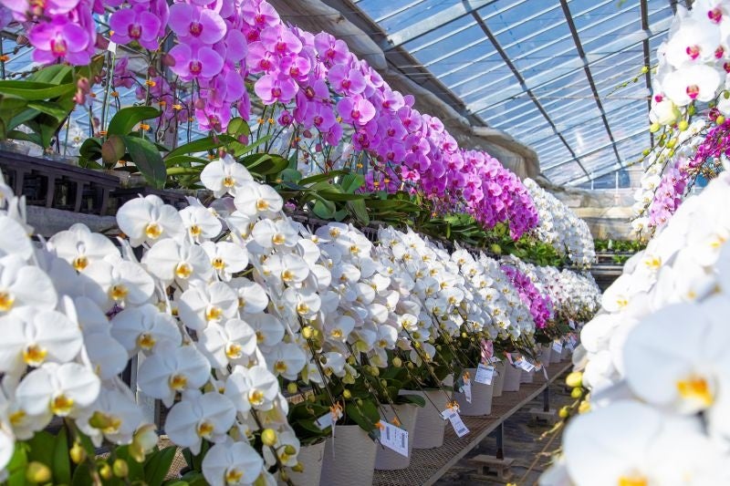 有田市の温暖な気候と豊富な日照時間は、東南アジア原産の胡蝶蘭にとって理想的な環境であり、花の大きさや色艶、根の力強さまで際立つ高品質な株の安定生産を可能にしています。