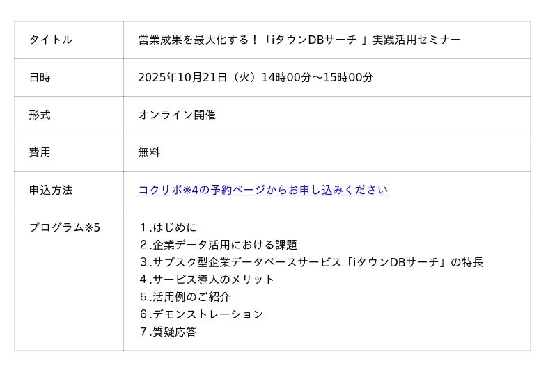 NTTタウンページ株式会社(本社:東京都中野区、代表取締役社長:村田 和也、以下「NTTタウンページ」)は、全国の企業・事業所情報を収録したiタウンDB (iタウンページデータベースの略称)を活用したSaaS型企業リスト検索サービス「iタウンDBサーチ」の販売を開始いたします。