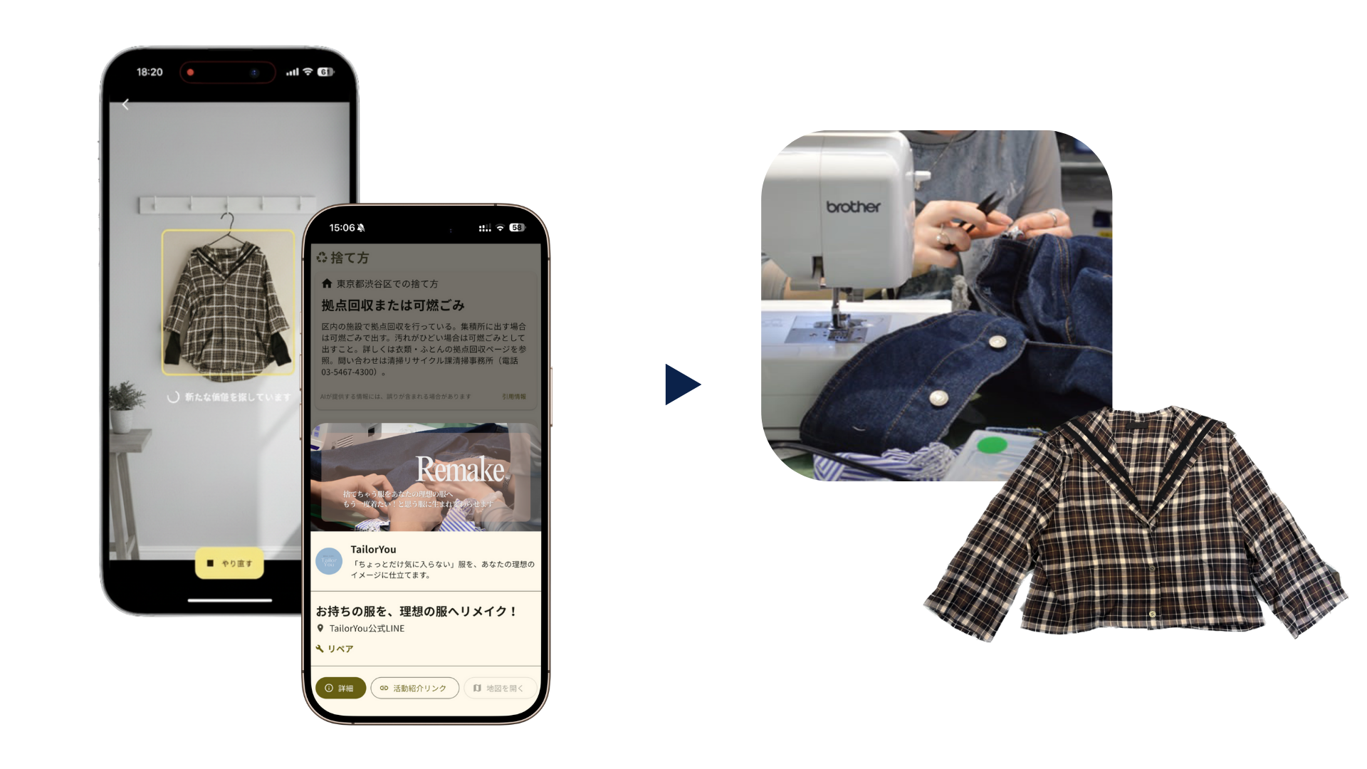 まず、その取り組みとして、「Trash Lens」を通じて本事業の協力団体である「TailorYou」のオンラインリメイクサービスとの連携システムを構築しました。これにより、ゴミとして廃棄されているはずだった衣類を有効活用し、都内で新たな衣類循環の流れを定着させることを目指します。