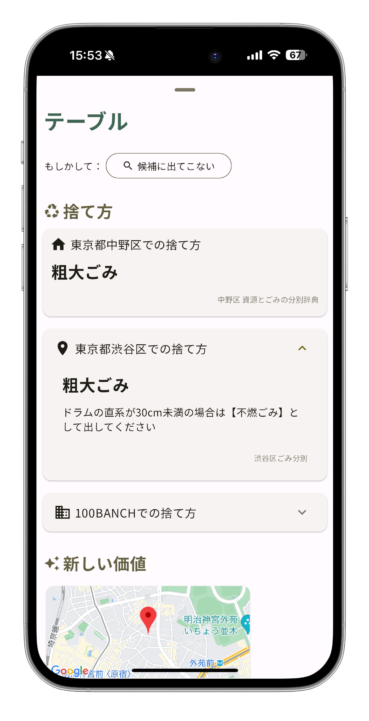 検出された情報をもとに、登録した自治体・現在地の自治体・現在地の施設での捨て方と、リユース・アップサイクルなどの可能性も提示