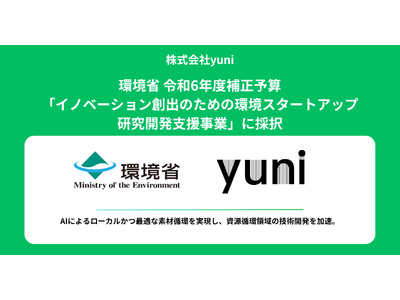 株式会社yuni(本社:東京都渋谷区、代表取締役CEO:内橋 堅志、以下「yuni」)は、環境省が実施する令和6年度(補正予算)環境保全研究費補助金「イノベーション創出のための環境スタートアップ研究開発支援事業」に採択されたことをお知らせいたします。