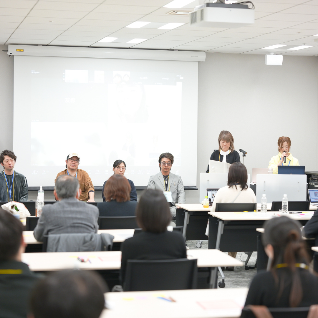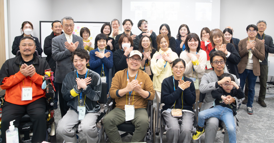 会場参加者とスクリーンに映るオンライン参加者全員で、ありがとうのポーズで記念撮影