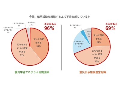 2024年震災伝調査調査第2弾「伝承を継続する上での不安」は、震災学習プログラム実施団体は96%、伝承施設は69%
