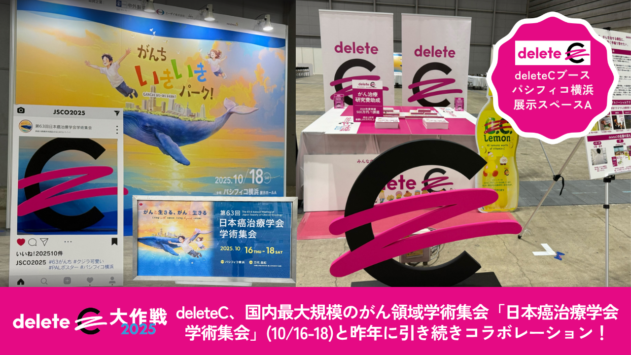 認定NPO法人deleteC(デリート・シー/代表理事:小国士朗)は、10月16日(木)~18日(土)にパシフィコ横浜で開催される第63回日本癌治療学会学術集会(会長 京都大学医学研究科 器官外科学講座 婦人科学産科学教室・ 教授 万代 昌紀)に昨年の学術集会に引き続き参加し、「みんなの力で、がんを治せる病気にする」ための活動紹介や新たな研究への繋がりがうまれる最前線の様子を市民に広くレポートします。