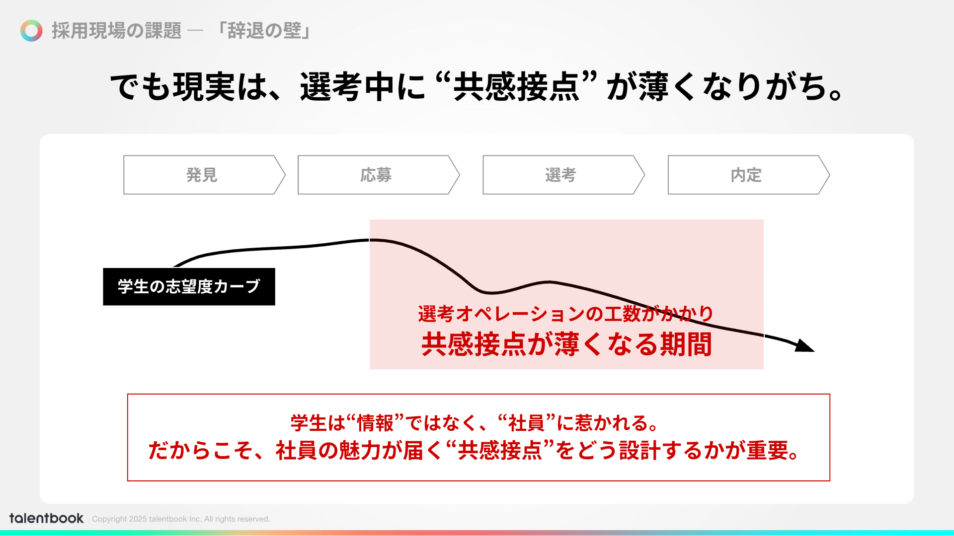 学生は"情報"ではなく、"社員"に惹かれます。だからこそ、選考プロセスにおいて社員の魅力が届く「共感接点」をどう設計するかが重要です。