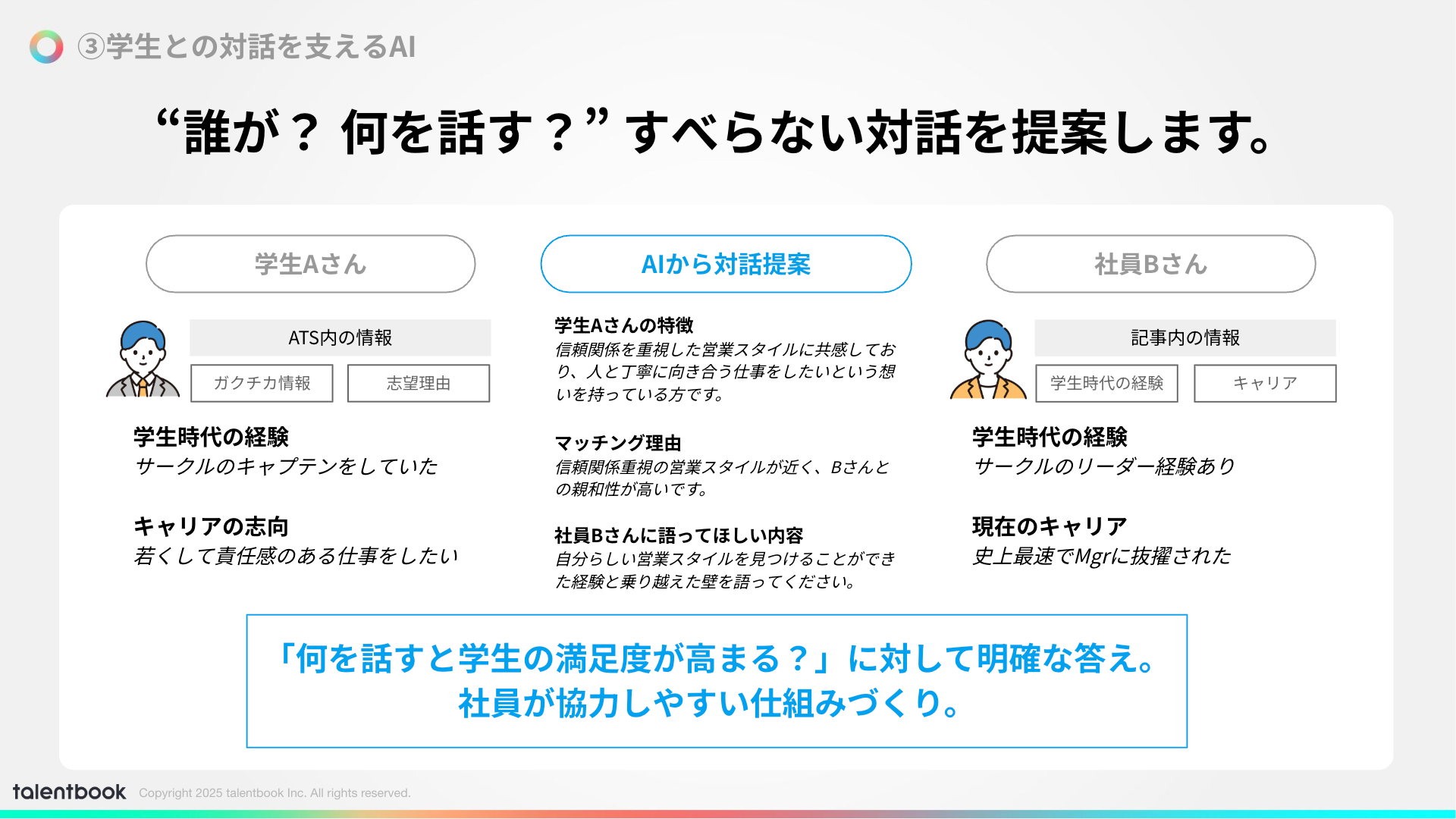 さらに、不安払拭・共感を生む対話内容を具体的に提案することで、「何を話すと学生の満足度が高まるか」に対して明確な答えを提供。ロールモデル社員が協力しやすい仕組みをつくり、全社巻き込み採用を実現します。