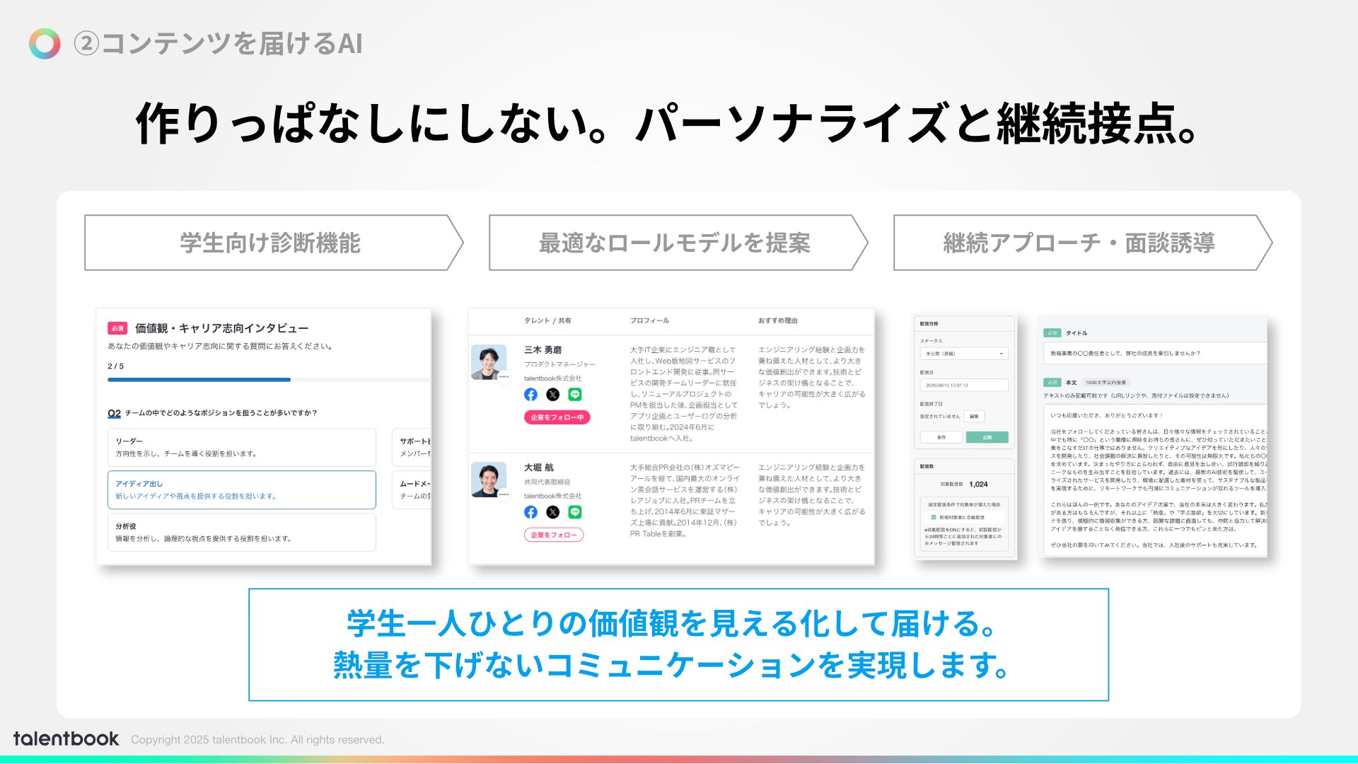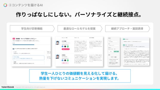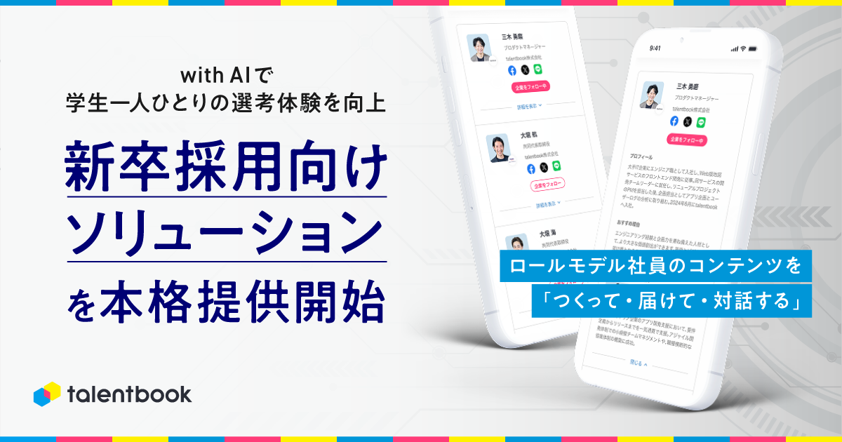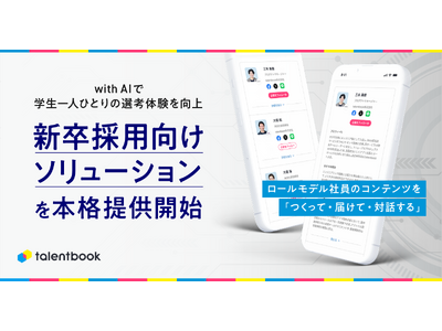 ロールモデル就活・転職サイト「talentbook」及び、法人向け採用ブランディング支援サービスを提供するtalentbook株式会社(本社:東京都渋谷区、共同代表取締役:大堀航/大堀海、以下「当社」)は、with AIで学生一人ひとりの選考体験を向上する新卒採用向けソリューションサービスの本格提供を開始いたします。
