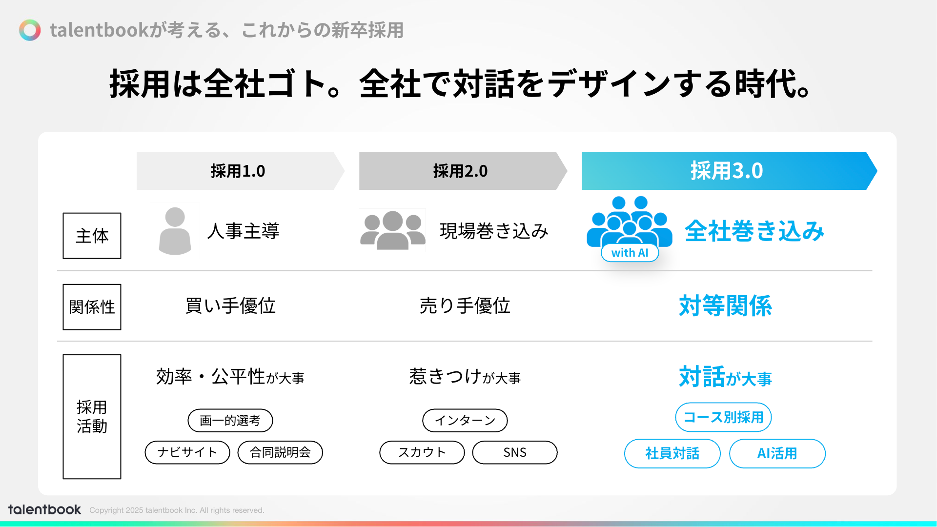 「採用3.0(全社巻き込み・対等関係)」の時代へと移行しています。
