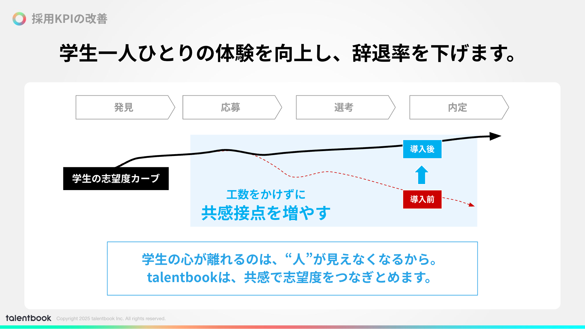学生・企業・社員それぞれに価値が還元される「三方よし」の状態を目指し、talentbookは、価値が循環する持続的な仕組みづくりを通じて、より納得度の高い採用マッチングの実現を今後も支援してまいります。