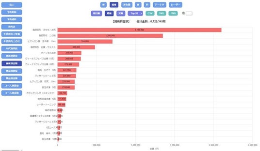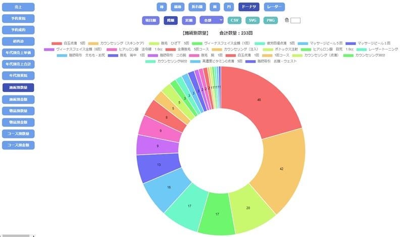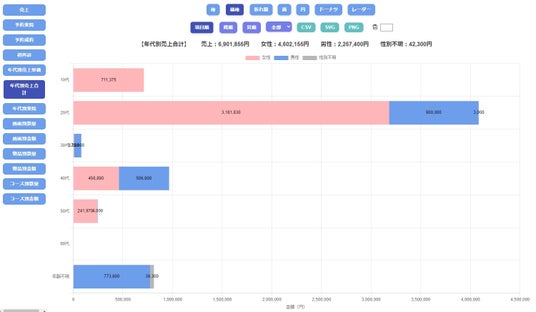 属性ごとの細かな集計が可能 年代別、施術別、物品別、コース別など、様々な視点での集計が一目でわかる設計。