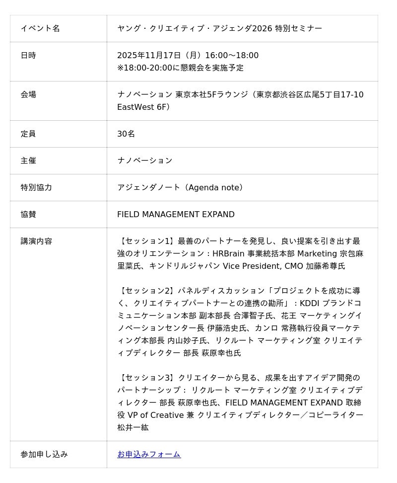 ヤング・クリエイティブ・アジェンダ2026開催決定! 11月17日 マーケター向け特別セミナー参加申込受付中(アジェンダノート)