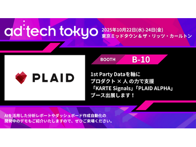 株式会社プレイド(東京都中央区:代表取締役CEO 倉橋健太)は、10月22日(水)~10月24日(金)に東京ミッドタウン&ザ・リッツ・カールトン東京で行われるアジア最大級のマーケティングカンファレンス「ad:tech tokyo(アドテック東京)」に「KARTE Signals」と「PLAID ALPHA」のブースを出展します。会期のうち、プレイドがブース出展を行うのは10月23日(木)・24日(金)の2日間です。