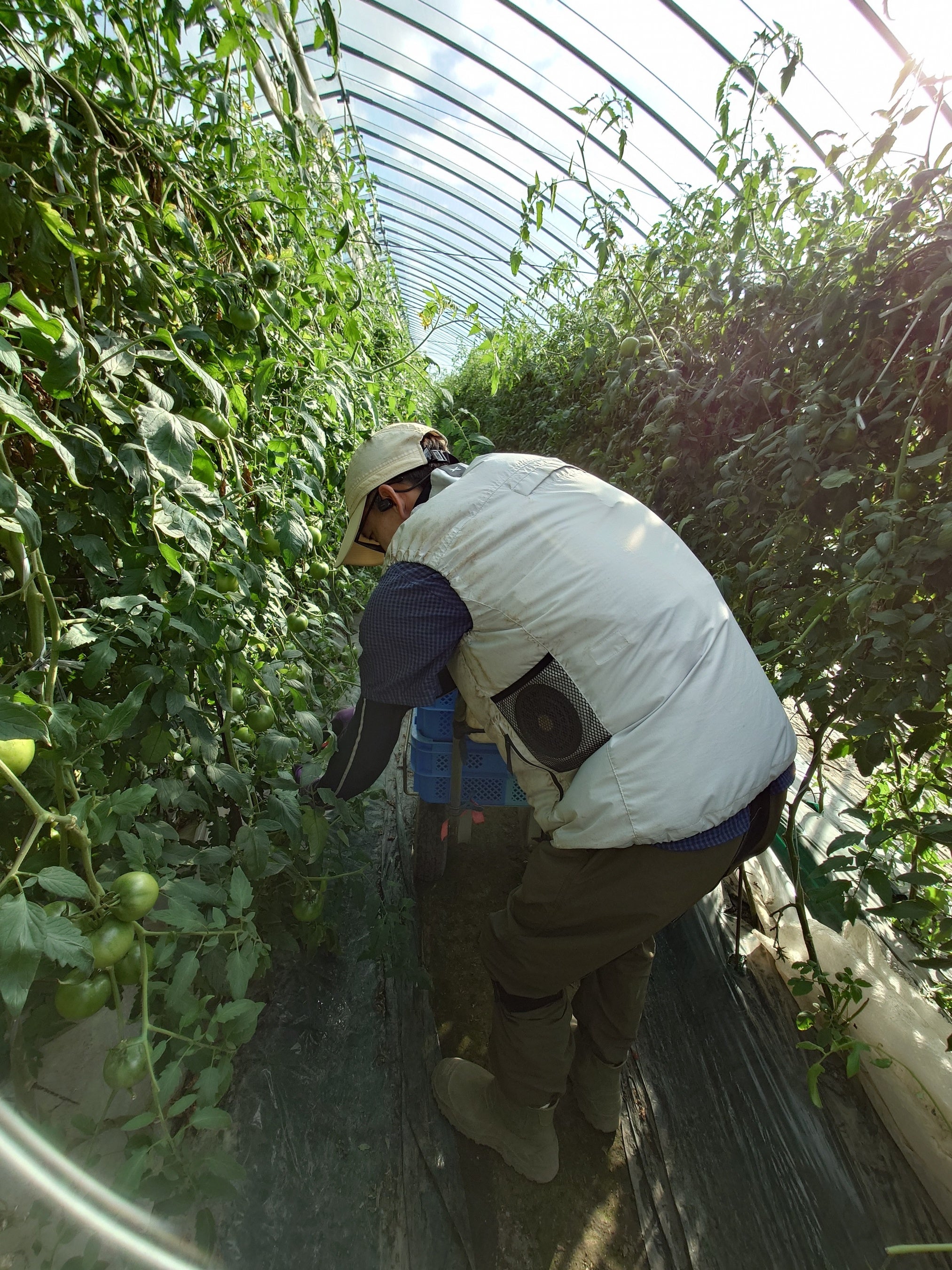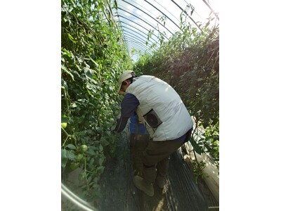 日本の農業は、就業者の高齢化や担い手不足が深刻化しています。農林水産省の統計によると、農業就業人口の平均年齢は令和6年には69歳を超え(※)、若い担い手が不足するなかで限られた人員が長時間の重労働を担っています。特にトマトやキュウリなど施設園芸における栽培現場では、前傾姿勢での収穫・誘引・仕立て作業が多く、慢性的な腰痛が大きな課題となっています。さらに夏季のビニールハウス内は高温多湿になりやすく、熱中症リスクが常に伴う環境です。従来はコルセットや簡易的な空調服などで対策を講じてきましたが、動きにくさや冷却性能不足といった制約から十分な効果が得られず、腰痛と暑さの「二重苦」が農業従事者の労働継続を阻む大きな要因となっています。こうした状況は離農や人材定着率の低下にもつながり、農業の持続可能性を脅かす深刻な課題です。
