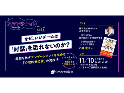 株式会社Smart相談室(本社:東京都港区、代表取締役・CEO:藤田 康男)は、2025年11月10日(月)19時より「スマソウナイトvol.1 『なぜ、いいチームは「対話」を恐れないのか?』 ~離職を防ぎエンゲージメントを高める「心理的安全性」の実践法~」を開催いたします。