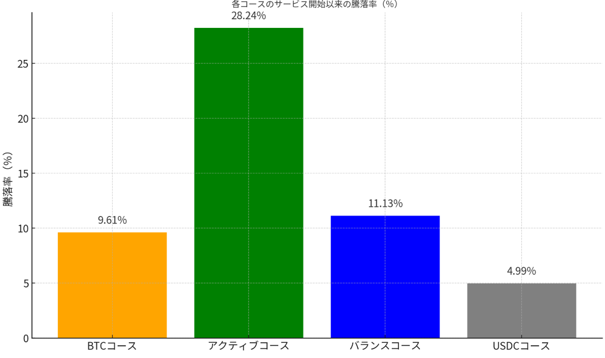 一方で、BTCコース・バランスコース・USDCコースも堅調な推移を見せており、価格変動の特性やリスク許容度に応じて、さまざまな運用体験が可能です。