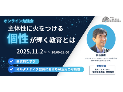 一般社団法人教育AI活用協会(所在地:東京都港区、代表理事:佐藤雄太)は、2025年11月2日(日)20:00~21:00にオンライン勉強会「主体性に火をつける、多様な個性が輝く教育とは