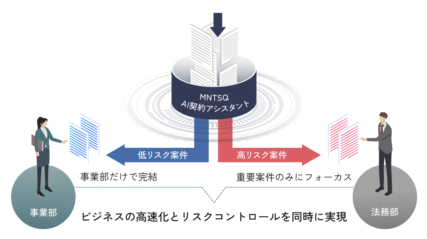 今回新たに導入いただく「MNTSQ AI契約アシスタント」は、AIを活用して低リスク案件を振り分け、高リスク案件のみを法務担当にエスカレーションすることができます。これにより、事業部門・法務部門双方において、低リスク案件に対する対処の効率化や省力化を実現すると同時に、高リスク案件をコントロールするために必要なリソースの拡充が可能です。