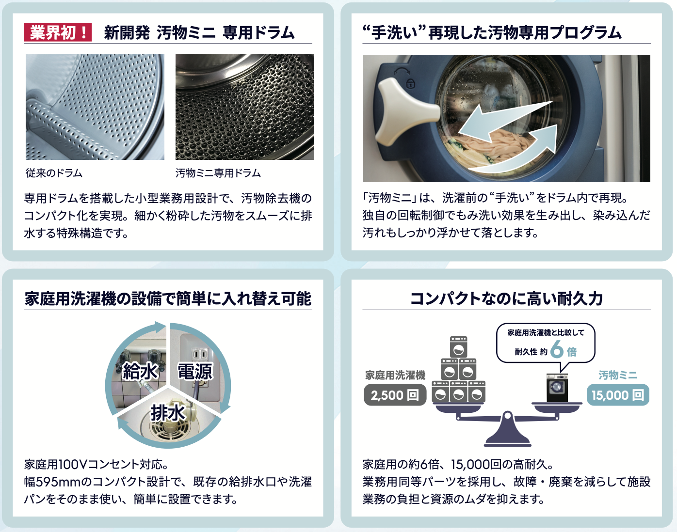 少子高齢化の進行により介護人材の不足は深刻化し、厚労省は2040年に約57万人の不足を試算しています。 だからこそ介護職の負担軽減と職場環境の改善は急務であり、その解決策として「洗濯から環境を変える」という新たな発想のもと、汚物処理を全自動化する小型汚物除去機を開発しました。