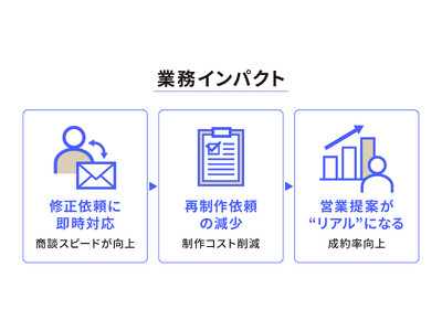 顧客の細かい要望にも即日対応が可能になり、初期提案後も「提案→修正→再提案」がワンストップで完結します。より具体的な顧客に寄り添う提案力を、コストを抑えてスピーディーに実現することで、