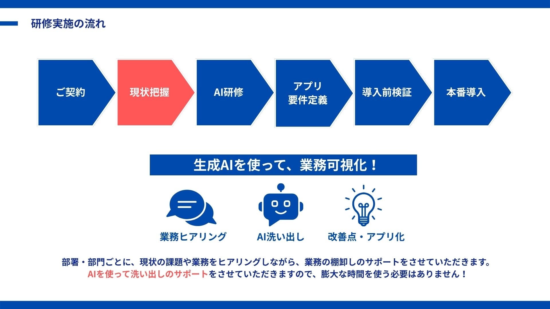 AI研修を「学び」で終わらせず、業務課題の解決まで寄り添い、確かな成果へ。