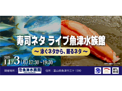 富山湾で泳ぐ魚たちが、寿司ネタになる。現存する日本最古の魚津水族館で、目の前の魚が“寿司になるまで”を「見て・知って・味わい」ながら楽しむ特別イベント「寿司ネタライブ魚津水族館~泳ぐネタから、握るネタ~」を開催します。水槽の中で生きる魚を“見る”から、職人が“握る”までを一気通貫で体験できるのはここだけ。漁師・寿司職人・高校生・学芸員など、地元の力がひとつになった、“富山のすし文化ライブショー”に、ぜひご参加ください。