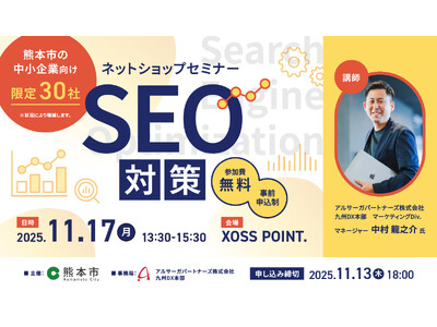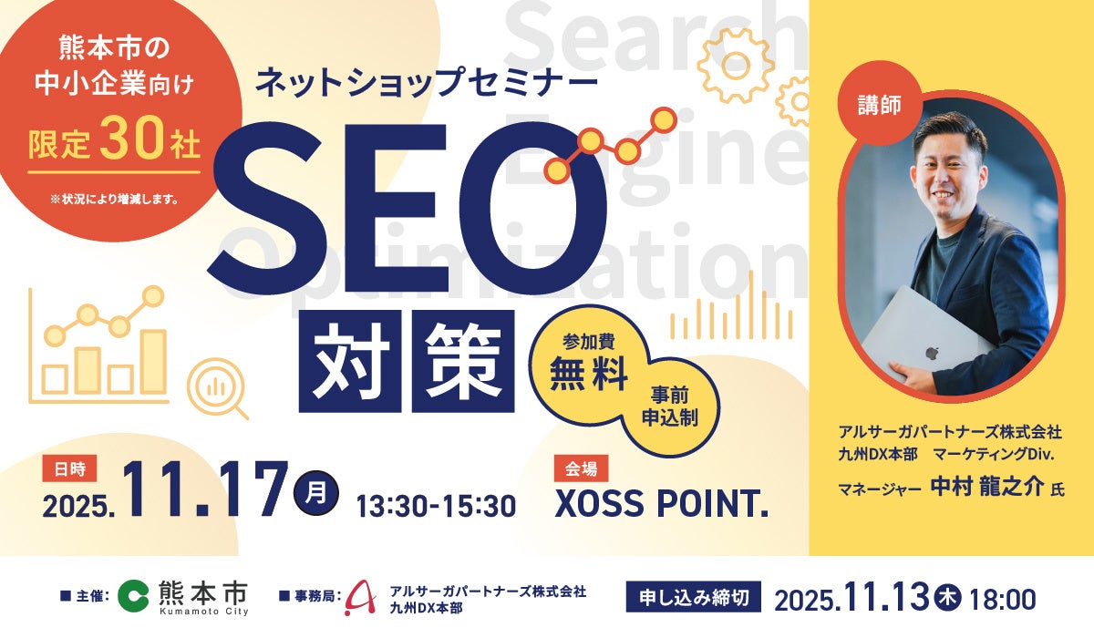 企業のDXを促進するアルサーガパートナーズ株式会社(本社:東京都渋谷区、代表取締役会長兼CTO:小俣泰明、代表取締役CEO:渡邉純平、以下「アルサーガパートナーズ」)は、11月17日(月)13:30~15:30に開催される、熊本市主催の「ネットショップセミナー“SEO対策”」において、九州DX本部マーケティングDiv. マネージャー中村が登壇することをお知らせします。