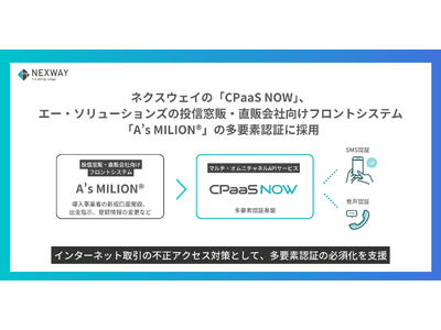 TISインテックグループの株式会社ネクスウェイ(本社:東京都江東区、代表取締役社長:坂本 倫史、以下:ネクスウェイ)は、マルチ・オムニチャネル※1APIサービス「CPaaS NOW」のSMS・音声認証機能が、株式会社エー・ソリューションズ(本社:東京都新宿区、代表取締役社長:荒木 幸男、以下:エー・ソリューションズ)が提供する、投信窓販・直販会社向けフロントシステム「A's MILION(R)」の多要素認証基盤として採用されたことを発表します。
