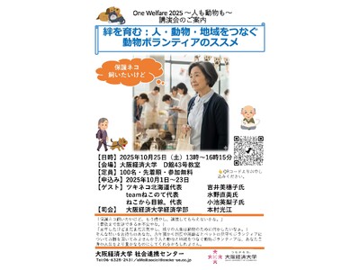 大阪経済大学(学長:山本俊一郎/所在:大阪市東淀川区)は、講演会「One Welfare2025~人も動物も~『絆を育む:人・動物・地域をつなぐ動物ボランティアのススメ』」を、2025年10月25日(土)13:00から、大隅キャンパスにて開催します。