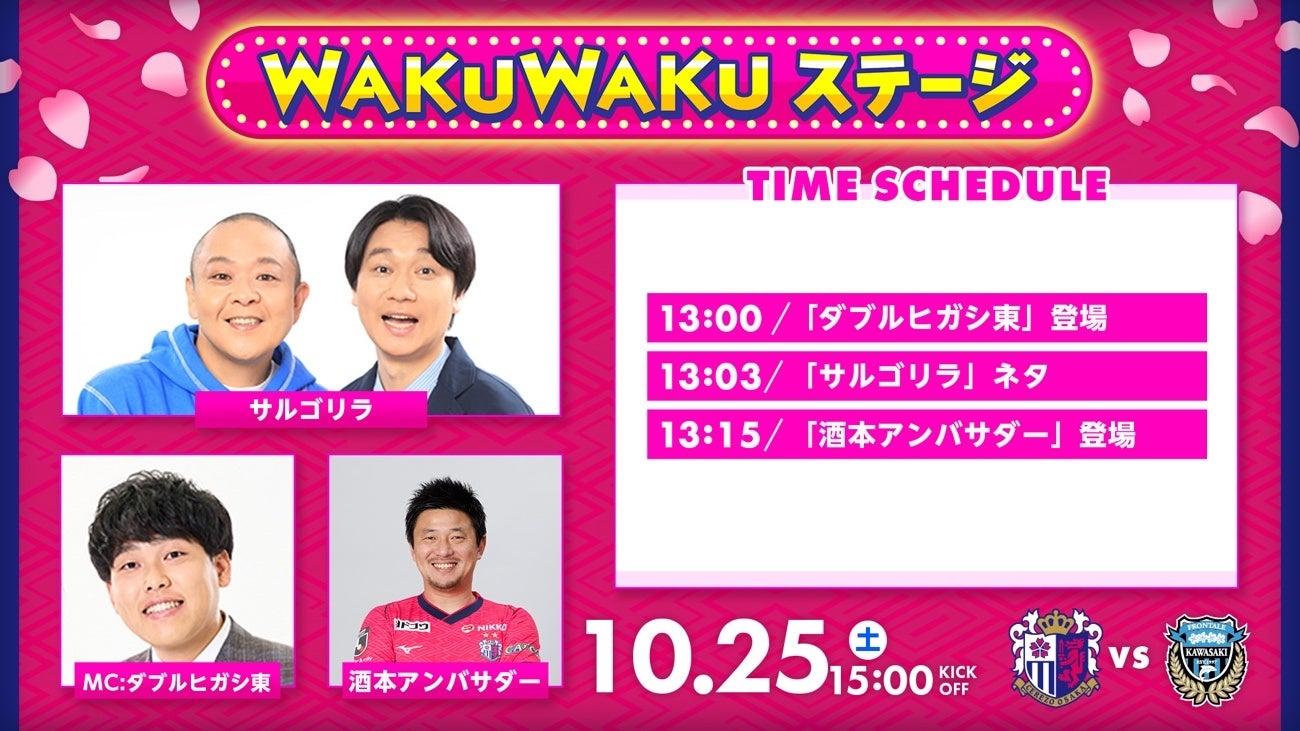 セレッソ大阪では2025シーズンも土日祝の試合を中心に、スタジアム場外でもWAKUWAKUを感じていただけるように「WAKUWAKUステージ」を開催いたします。メインMCに