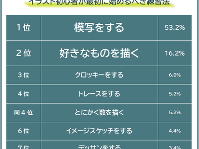 「イラスト初心者が最初に始めるべき練習法」を聞いたところ、圧倒的1位は「模写をする(53.2%)」でした。2位「好きなものを描く(16.2%)」、3位「クロッキーをする(6.0%)」が続きます。