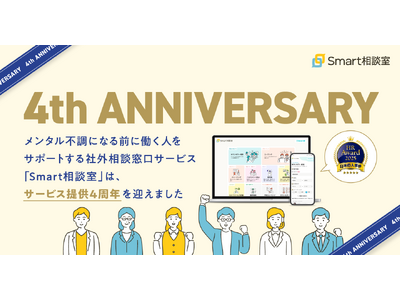 株式会社Smart相談室(本社:東京都港区、代表取締役・CEO:藤田 康男)は、2025年10月18日に、誰でも・いつでも・なんでも気軽に相談できる、法人向け社外相談窓口サービス「Smart相談室」正式版の提供開始から4年を迎えました。多くのみなさまのご支援に感謝するとともに、サービス提供を通じて、これからも企業の健康経営と働く人の心の健康に貢献してまいります。
