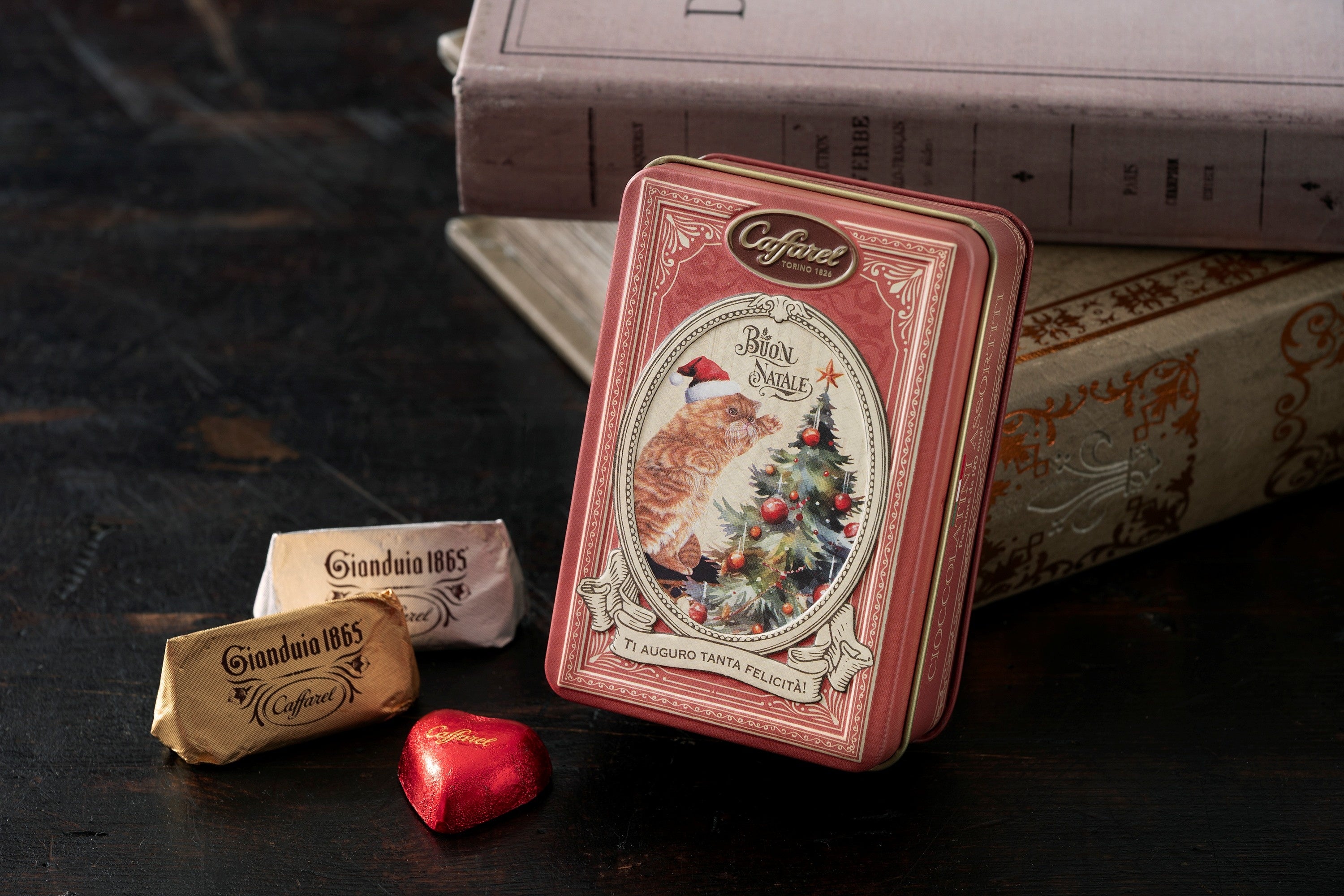 詳細:クラシカルなエンジ色にクリスマスプレゼントに囲まれた女の子が猫と戯れるシーンがデザインされた蝶番缶。イタリア語で「クリスマスがやってきました。動物たちが森のクリスマスツリーを飾っています。皆がその日を待ち望んでいます」というメッセージが入っております。中にはカファレルの代名詞であるジャンドゥーヤや人気のピエモンテに加え、キャットやきのこ、てんとう虫のホイルチョコレート、ミニハートのホイルチョコレートなど合計20粒アソート。