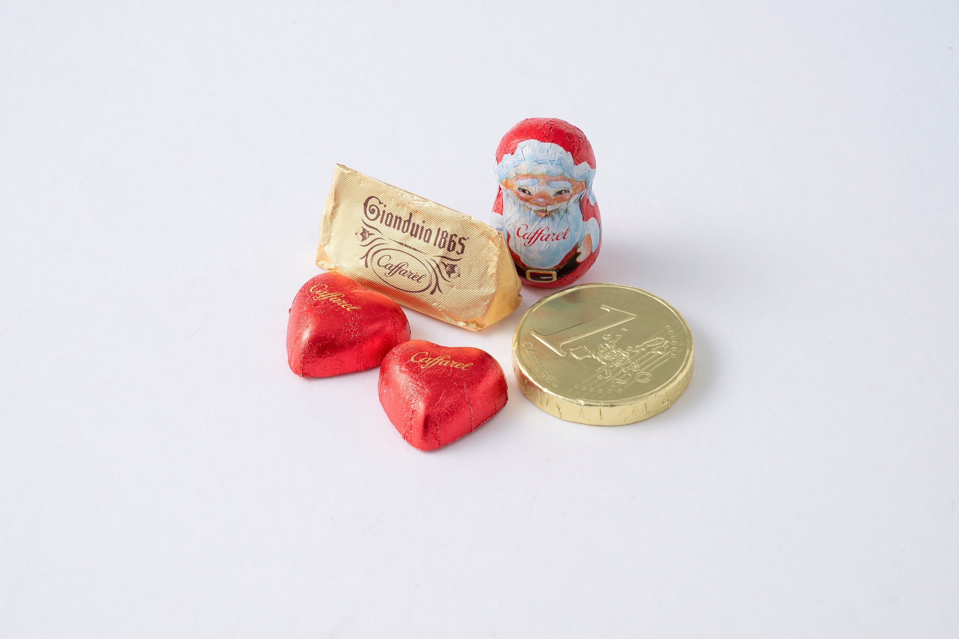 詳細: クリスマスのプチギフトにもおすすめの蝶番缶です。イタリア語で「あなたに幸せを祈っています」というメッセージと可愛い猫がクリスマスツリーを飾りつけしているほほえましいシーンが目を惹くデザイン。蓋はエンボス加工されており、高級感もあります。サンタクロースのホイルで包まれたバッポナターレ、定番のジャンドゥーヤ、ハートとユーロコイン型のチョコレート合計5粒アソート。