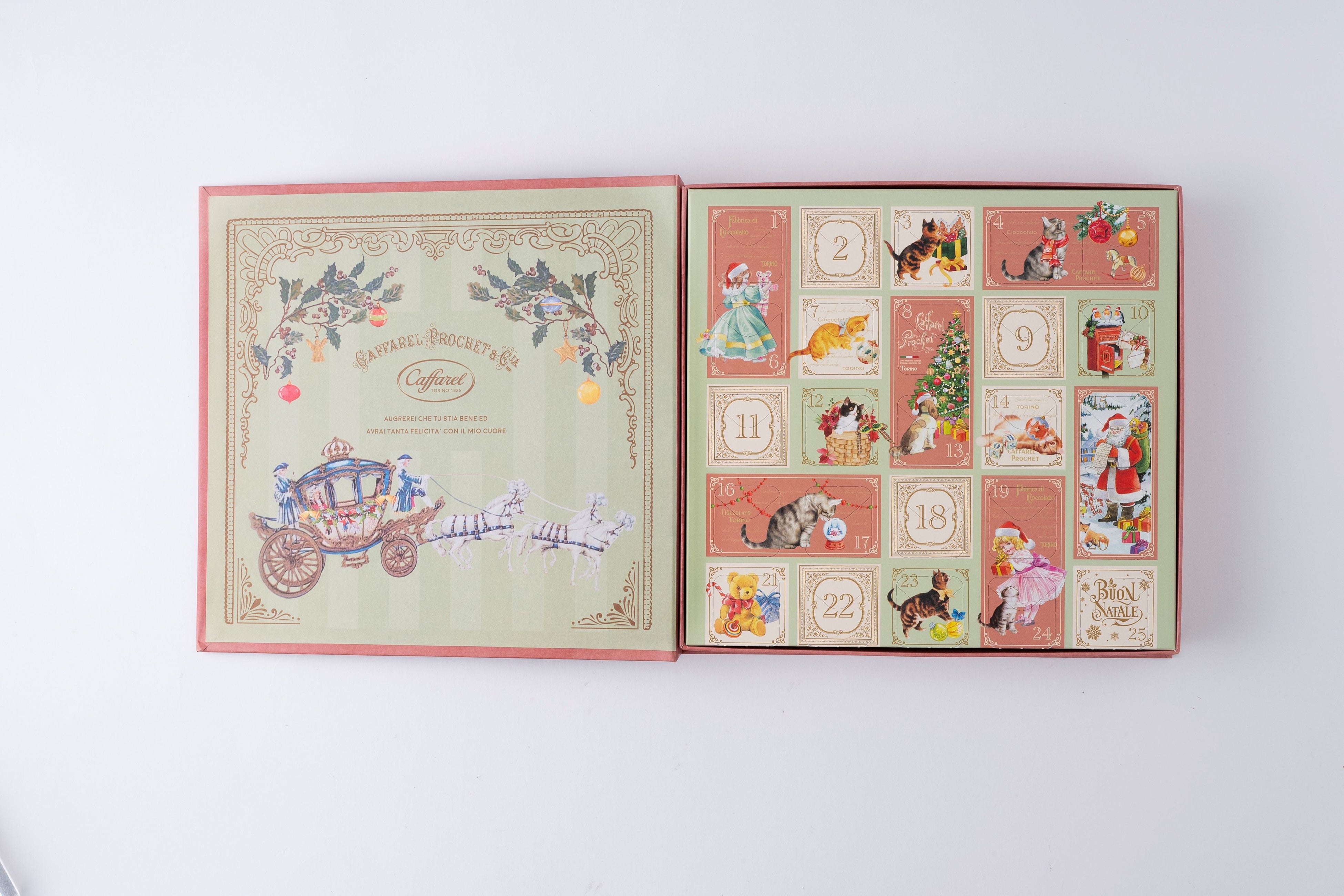詳細:毎年人気のカレンダー。今年はアンティークな絵本をイメージにしたブック型。描かれているカファレルの動物や女の子達のイラストがそれぞれの世界に飛び出し、カファレルのクリスマスコレクションを盛り上げます。ブックの扉を開けると、華やかな馬車のイラストが楽しいクリスマスパーティへと誘います。カウントダウンページには、クリスマスを待ちわびるカファレルの仲間たちが描かれ、中にはカファレルを代表するジャンドゥーヤをはじめ、サンタやキノコ、キャットのホイルチョコレートなど、人気のチョコレートが全25粒アソート。クリスマス気分を盛り上げてくれるオススメのチョコレートブックです。