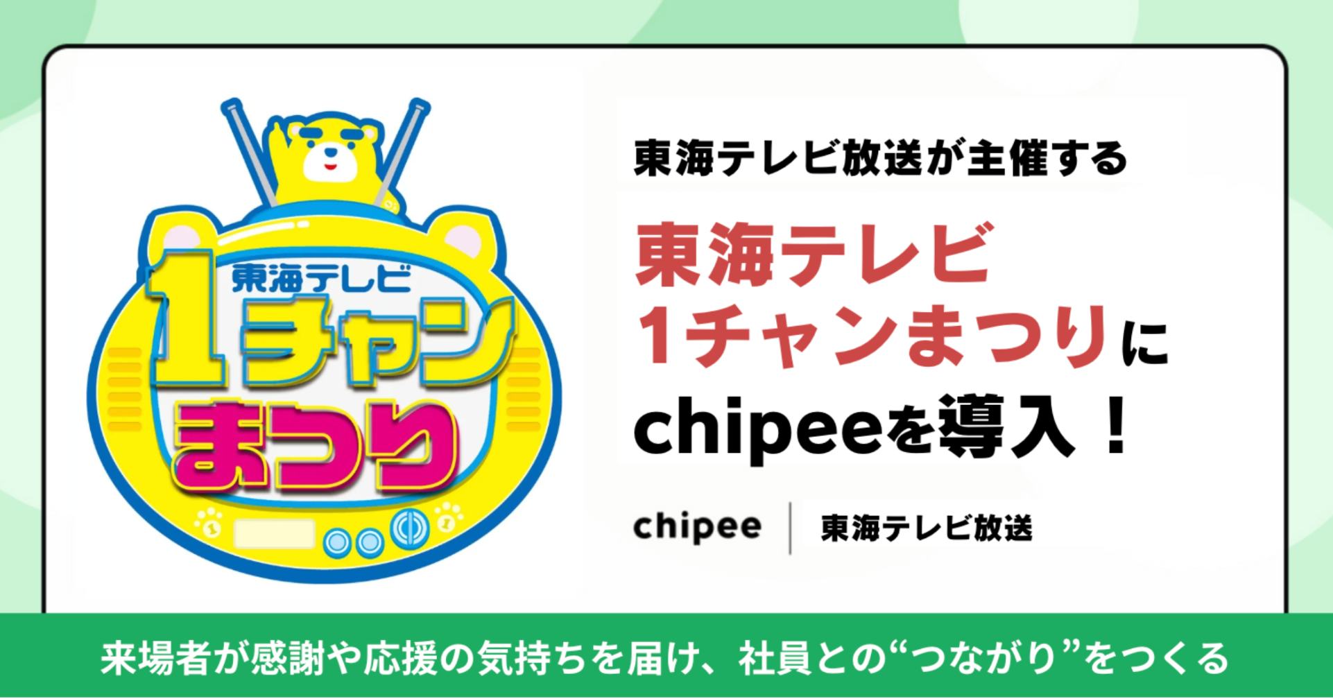 「こころとこころをつなぎ、世界を思いやりで満たす」をパーパスに掲げ、ウェルビーイング経営の実現を支援する株式会社チッピー(本社:東京都渋谷区、代表取締役:山崎令二郎)は、2025年10月25日(土)~26日(日)に名古屋・栄の久屋大通公園(エンゼル広場・エディオン久屋広場)で開催される東海テレビ放送株式会社(本社:愛知県名古屋市、代表取締役社長:林泰敬)主催の「東海テレビ 1チャンまつり」において、来場者の“ありがとう”や“応援”の気持ちを可視化し、社員の働きがいを高める仕組み「Chipee(チッピー)」の導入が決定しました。