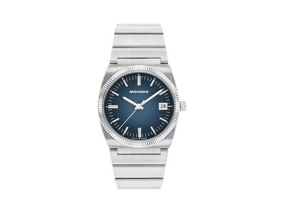 この36mm の時計は、ブルーのグラデーションダイアル、フルーテッドベゼル、ステンレススチールの針を備えています。