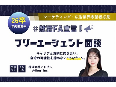 BtoBマーケティングコンサルティングを手がける株式会社アドブシ(本社:東京都新宿区、代表取締役:関口典史)は、2026年3月卒業予定の学生を対象に、「フリーエージェント面談」の受付を本日より開始いたしました。