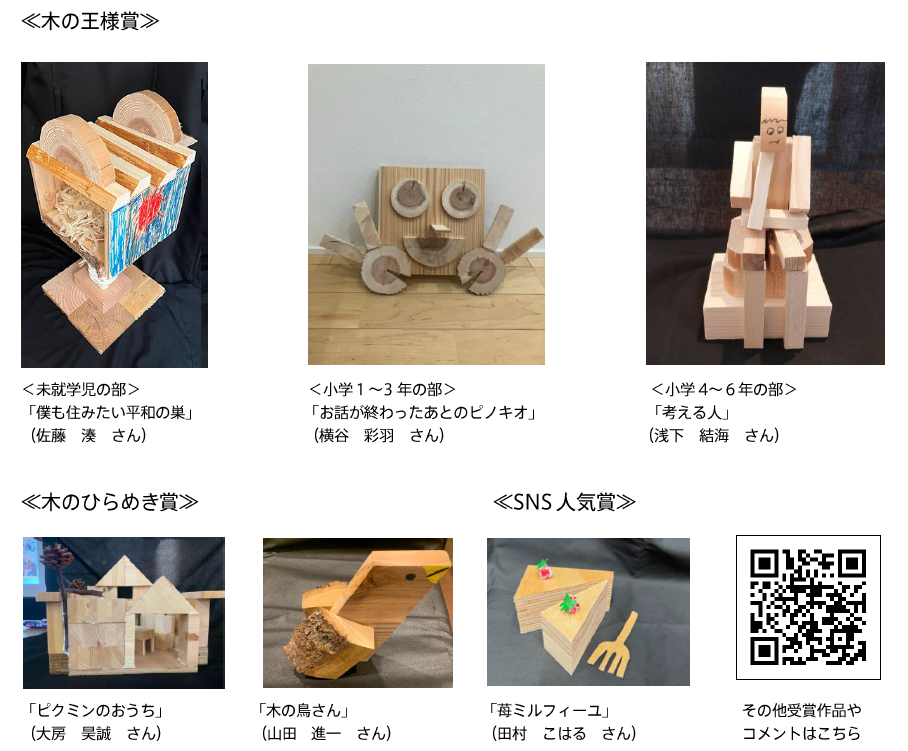 また、“ひらめき”と創造力の豊かさを称える「木のひらめき賞」には、「ピクミンのおうち」「木の鳥さん」が、弊社公式Instagramの一般投票によって選ばれる「SNS人気賞」には「苺のミルフィーユ」が輝きました。いずれの作品も、子どもたちが廃材を「新しい価値を生み出す資源」として捉え、木の温もりと “へいわ”への想いを巧みに融合させた点が特徴です。