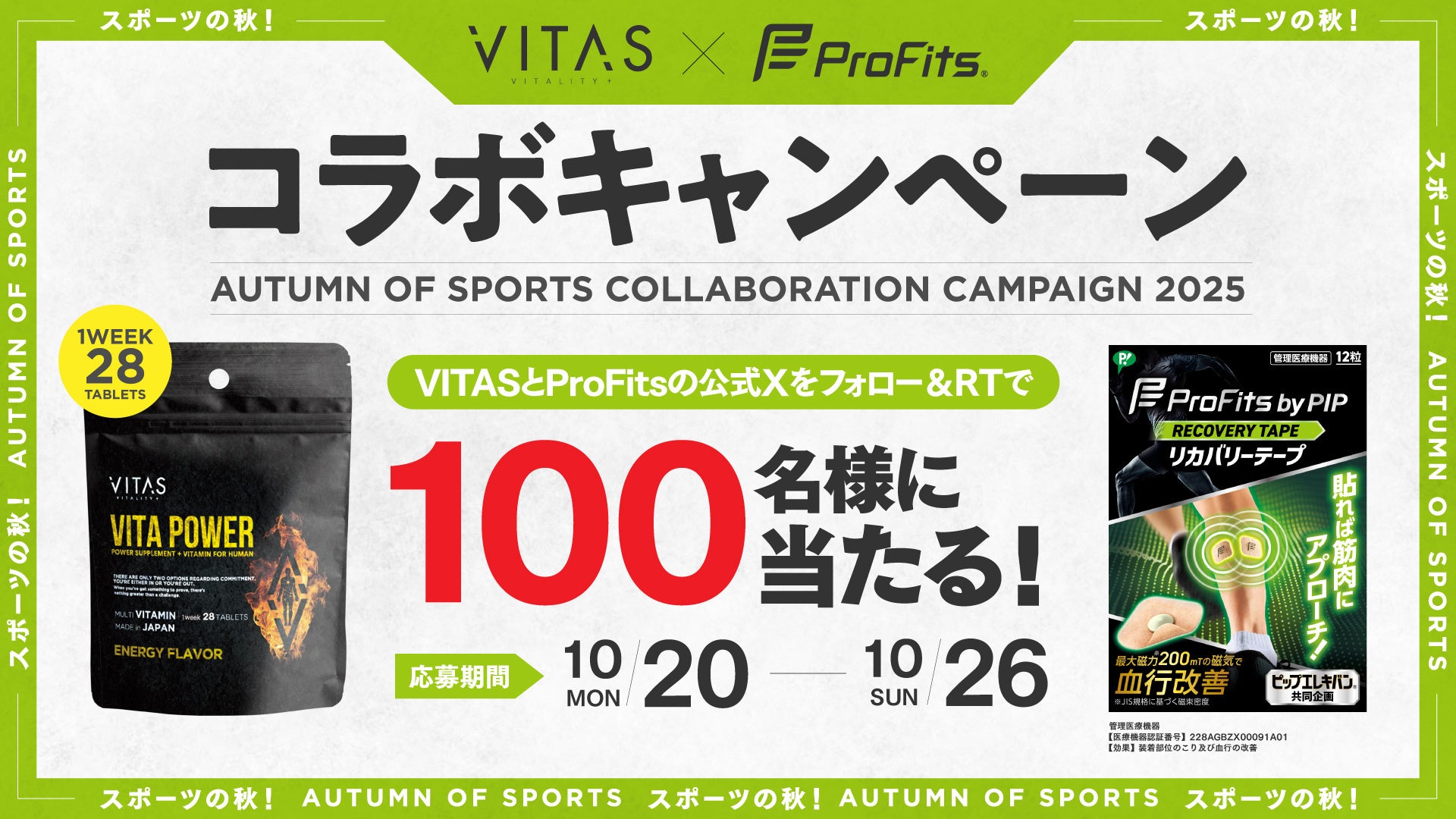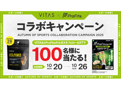 ニュートリションブランド「VITAS」は、ピップ株式会社(本社:大阪市中央区、代表取締役:松浦由治)が運営するスポーツケア用品ブランド「プロ・フィッツ」とのコラボレーションによるプレゼントキャンペーンを、2025 年 10 月 20 日(火)~ 26 日(火)の期間限定で実施いたします。